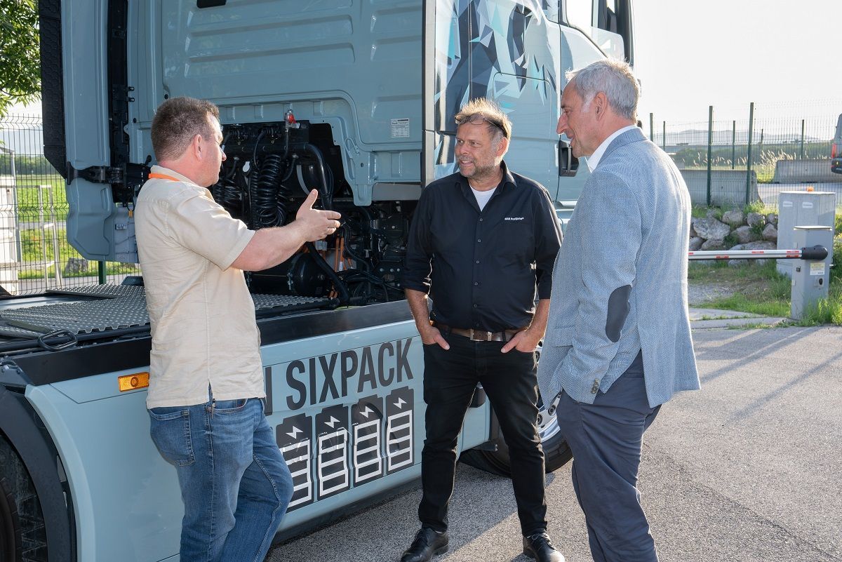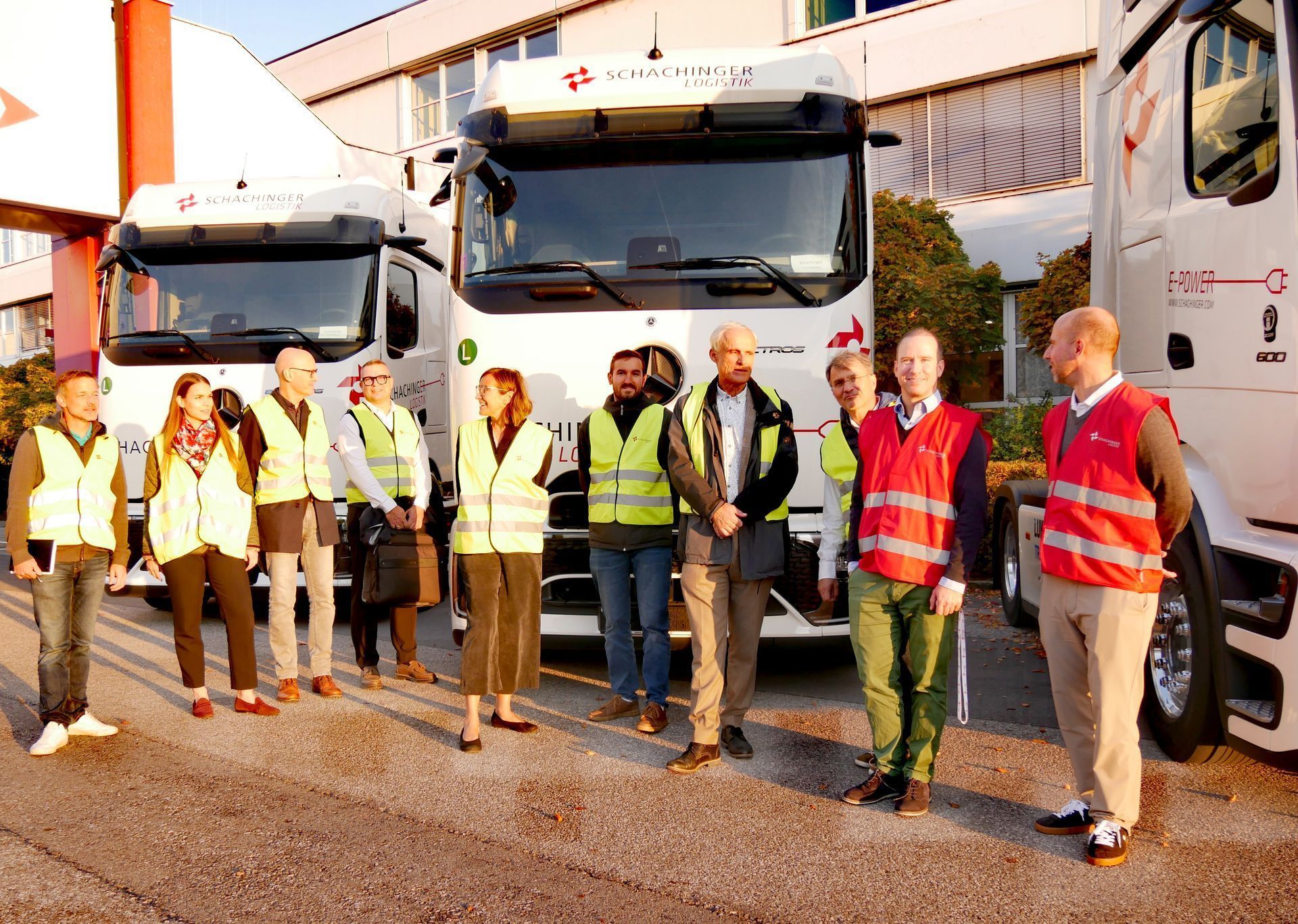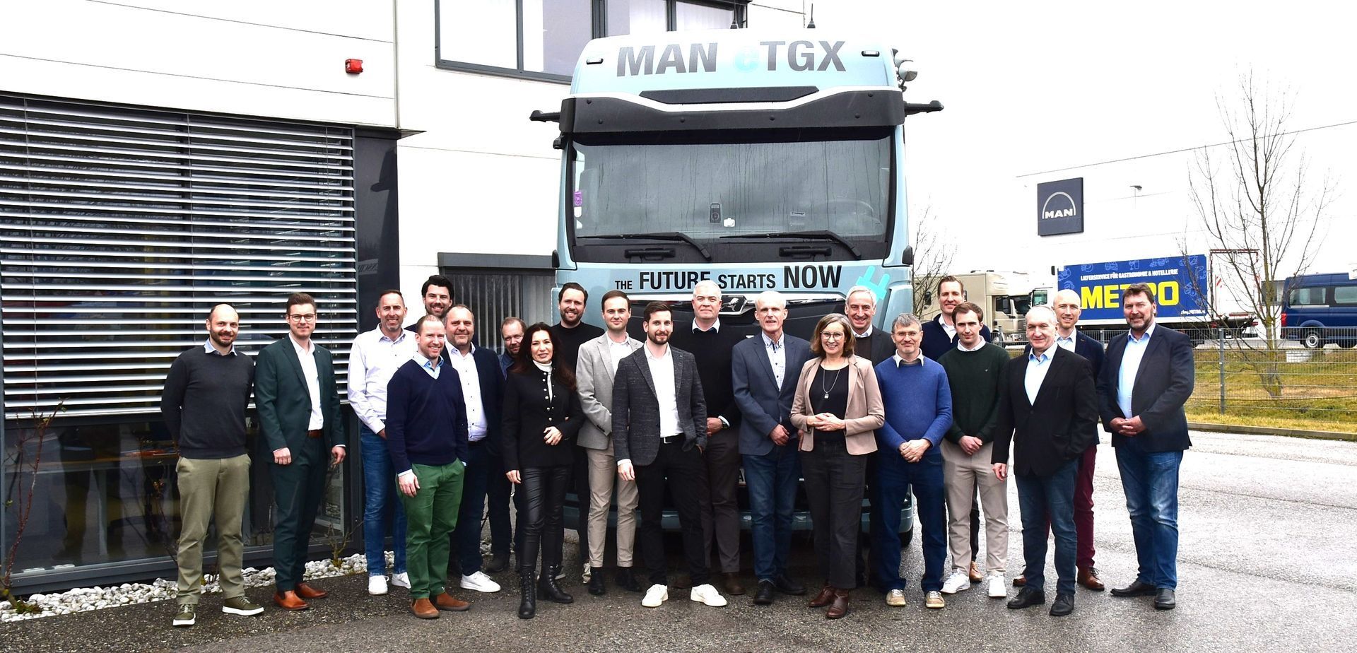 Foto ((C) MAN): Teilnehmer des CNL-Meetings von DSV, Gebrüder Weiss, HOFER, Lidl Österreich, Magna, Post, Quehenberger, Schachinger, SPAR und Wiener Stadtwerke diskutierten mit MAN Truck&Bus, TRATON und AkkuSWap über die Möglichkeiten, Chancen und Herausforderungen der Elektromobilität in der Logistik: